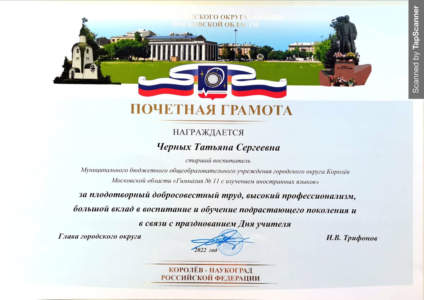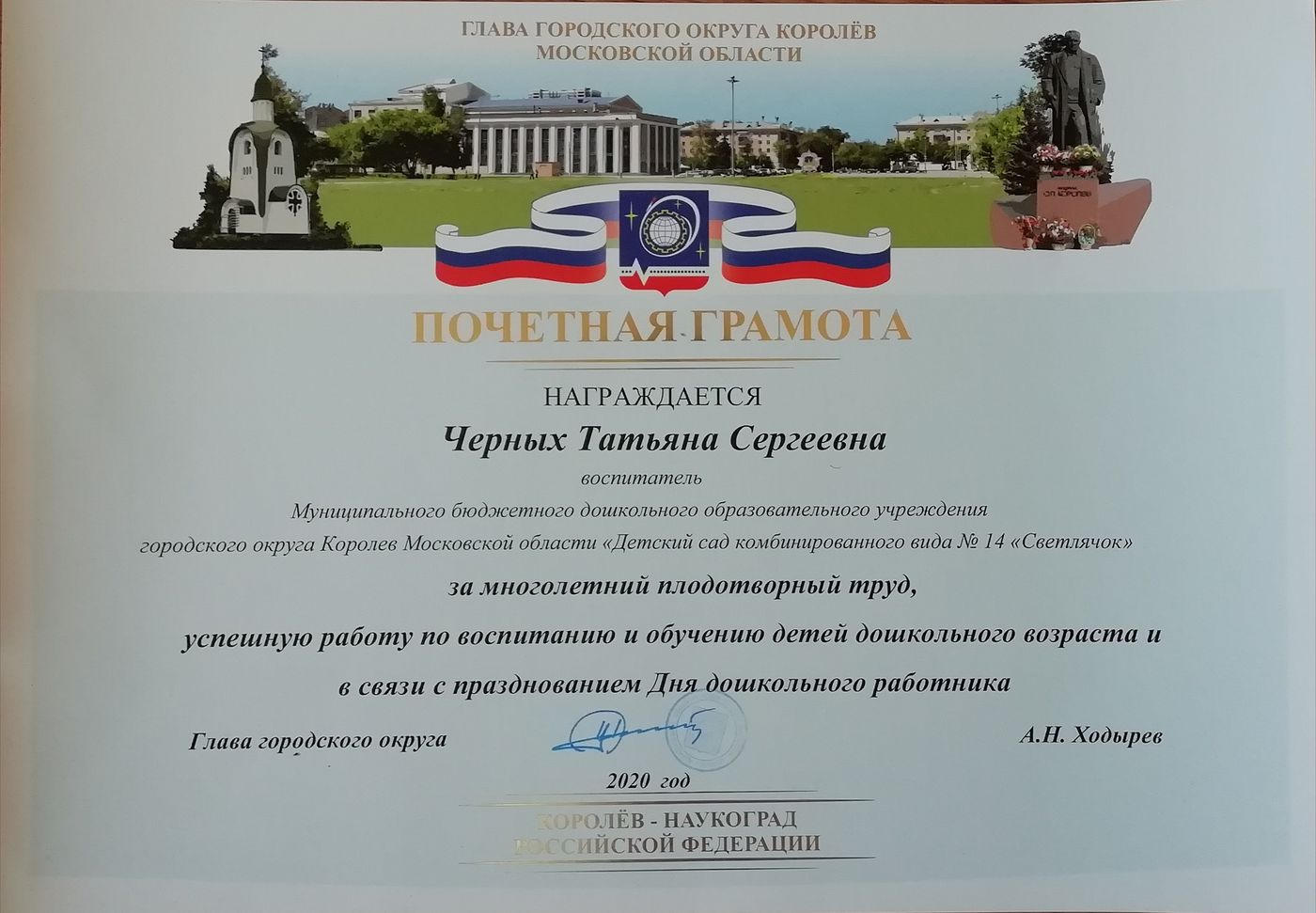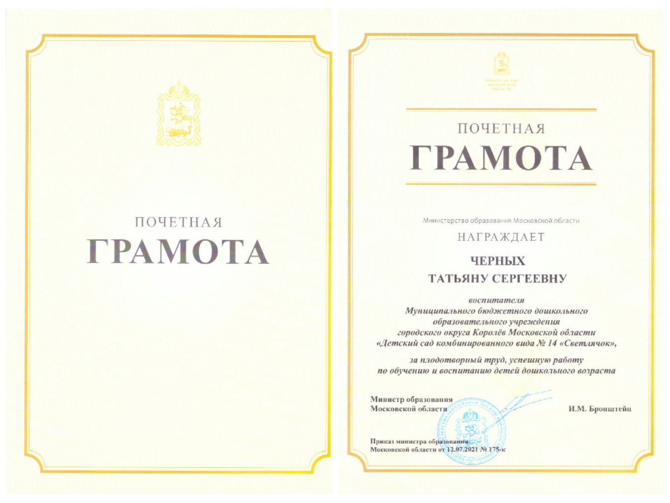 ПОЧЁТНАЯ ГРАМОТА Министерства образования Московской области, 2021 г. ПОЧЁТНАЯ ГРАМОТА Главы городского округа Королёв Московской области А.Н.Ходырева , 2020 г.
